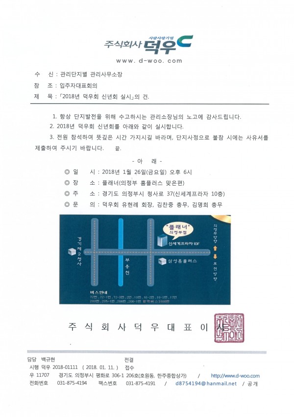■ 2018년 덕우회 신년회를 개최합니다. 페이지 정보 작성자 최고관리자 (115.♡.139.242) 작성일18-01-11 13:06 조회8,209회 댓글0건 관련링크 이전글 다음글 목록 본문 전원 참석하시어 뜻깊은 시간을 가졌으면 좋겠습니다.단지사정으로 불참시에는 사유서를 제출하여 주시기 바랍니다. 댓글목록 등록된 댓글이 없습니다. 이전글 다음글 목록
